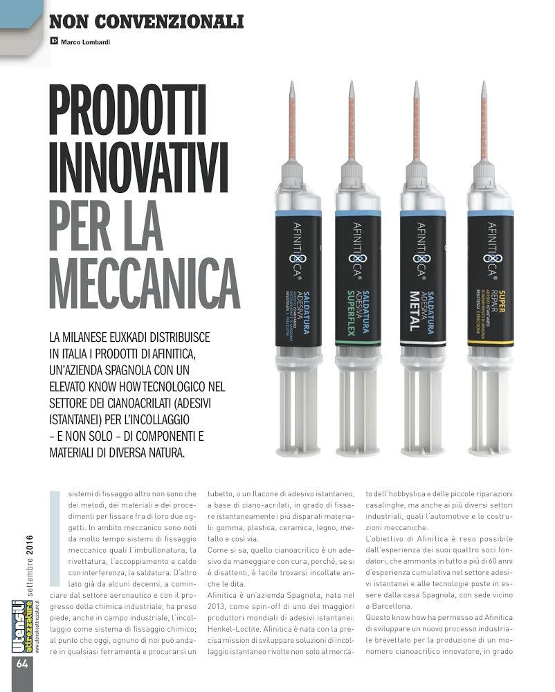 The Italian magazine “Utensile e Attrezzature” shows the innovations in the product portfolio of AFINITICA. The article describes the main characteristics of our adhesives, from the non-irritant serie to the bi-components. In AFINITICA we provide you the latest innovations in the development of cyanoacrylate adhesives to offers you professional solutions.